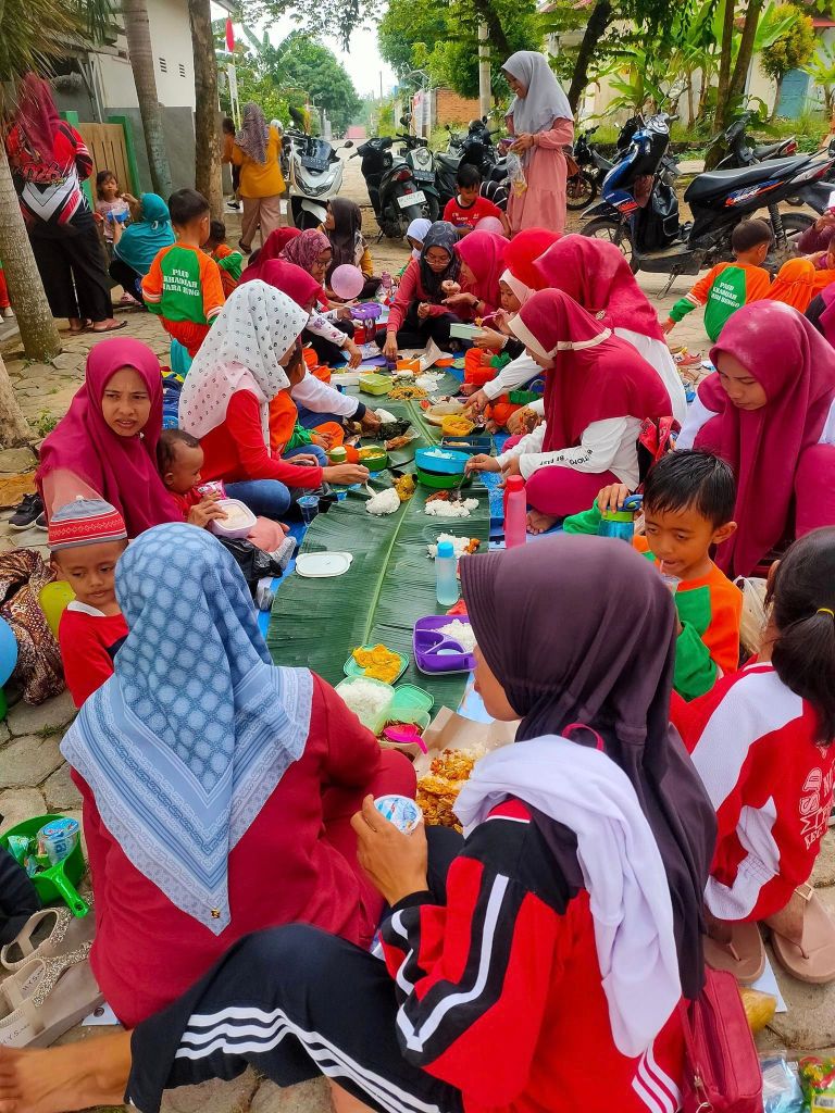 Setelah lomba lomba dilanjutkan dengan makan bersama yang dialaskan daun pisang, makan yang sudah dipersiapkan dari rumah masing-masing.